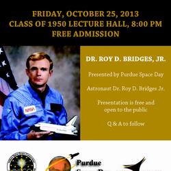 The 18th annual Purdue Space Day (PSD) will take place the weekend of Friday October 25th and Saturday October 26th with guest VIP astronaut Dr. Roy D. Bridges Jr. MSAE’66; DEA’98; OAE’99, HDR’01