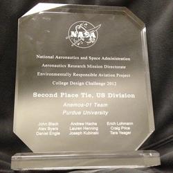 Team Aeolus Industries tied for 2nd place in College Design Challenge 2012 Environmentally Responsible Aviation (ERA) Project. The contest was sponsored by the NASA's Aeronautics Research Mission Directorate