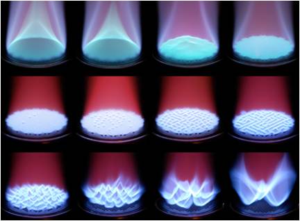 A description of the effect – CH4 / Air premixed flame attached to a carbon brass matrix cooled with water. Fuel rich to fuel lean from left to right and top to bottom by increasing air flow rate and decreasing CH4 flow rate. Small flames dance around and a butterfly appears. When the butterfly flies away, the flame is gone."