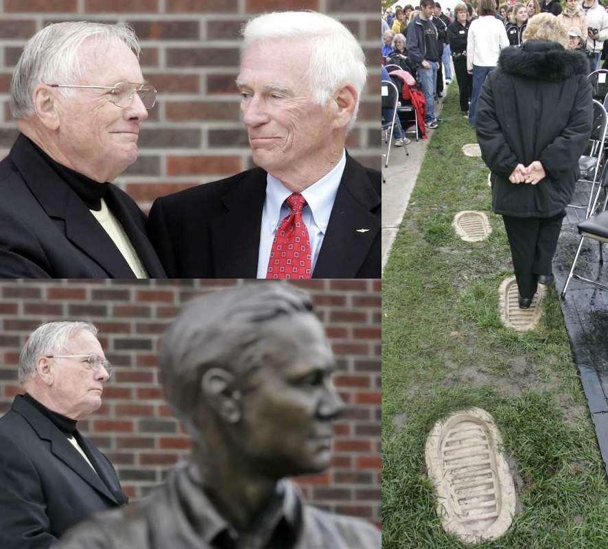 The Purdue Student Government arranged the Purdue Armstrong Memorial outside of Armstrong Hall on August 27. One of the anecdotes that we heard from author John Norberg, was that Neil had been thinking of going to MIT, but decided to take a closer look at Purdue due to the football team’s success against Ohio State in October 1945. Once he looked, he found a world-class aeronautics program and an airport on campus. The rest – as we say – is history.