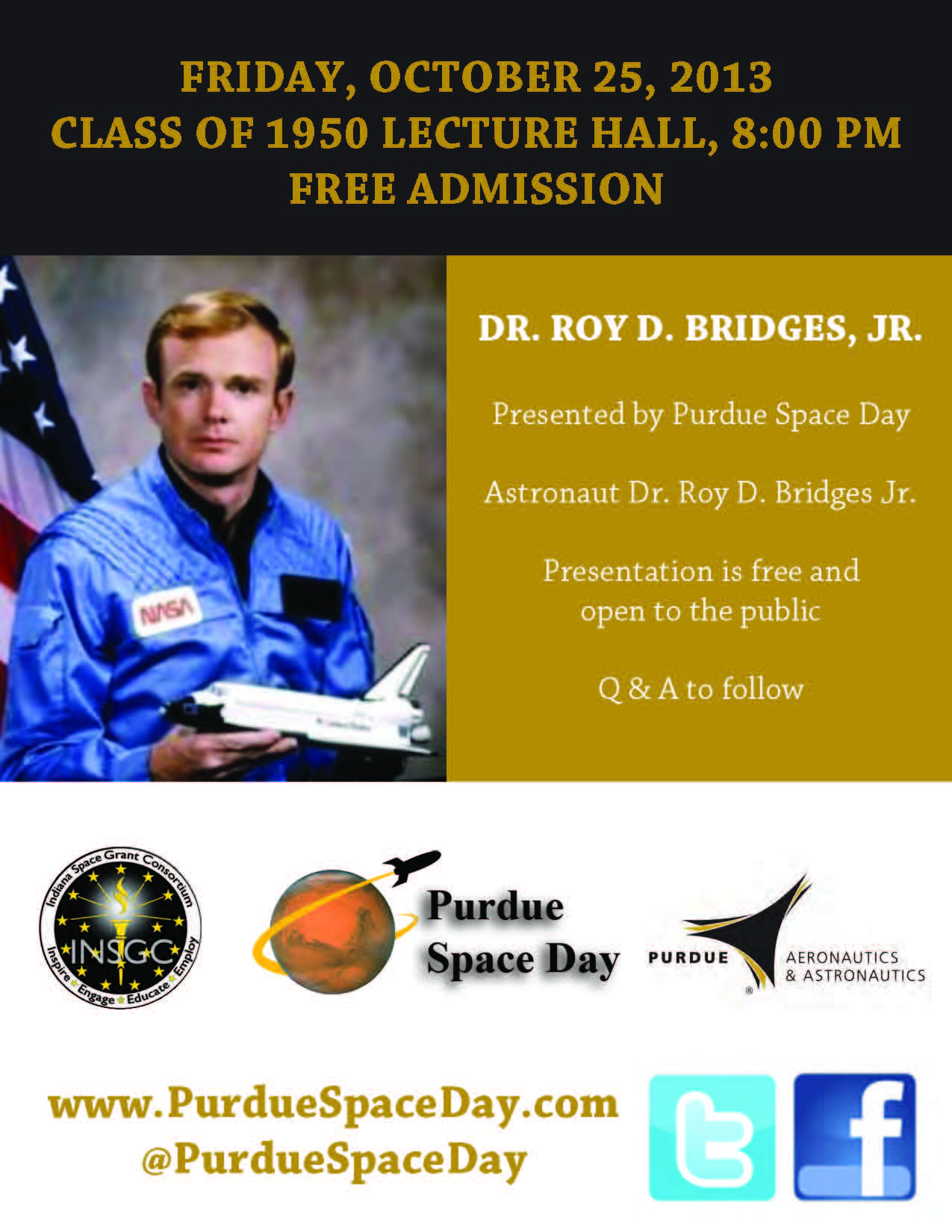 The 18th annual Purdue Space Day (PSD) will take place the weekend of Friday October 25th and Saturday October 26th with guest VIP astronaut Dr. Roy D. Bridges Jr. MSAE’66; DEA’98; OAE’99, HDR’01
