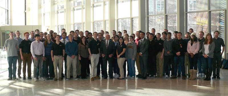 As a part of ongoing collaborations, Gemini and Apollo astronaut, Dr. Buzz Aldrin was in the School of Aeronautics and Astronautics to interact with Professor James Longuski’s students. Dr. Aldrin spent time with the Advanced Astrodynamics Concepts research group and the students in the senior design course, AAE 450.