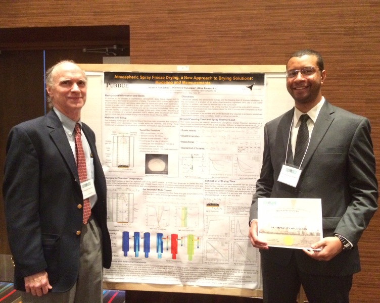 School of Aeronautics and Astronautics Ph.D. student Israel Sebastiao was awarded the Dr. Thomas Jennings Award for best poster at the International Society of Lyophilization/Freeze-Drying Conference on Chicago on April 9, 2015.