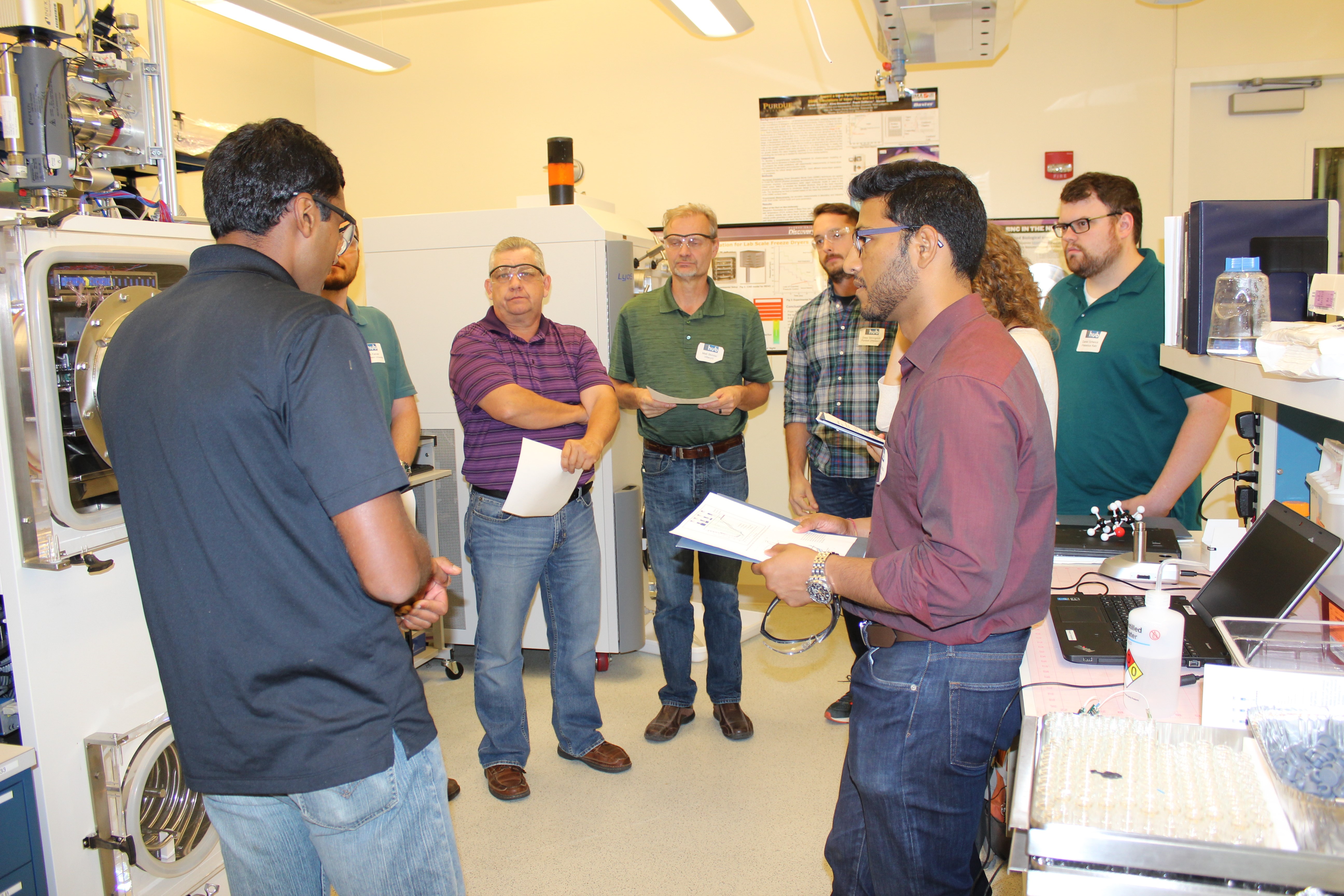 Last month, AAE Professor Alina Alexeenko and AAE PhD Students Drew Strongrich, Gayathri Shivkumar and Dr. Tong Zhu served as instructors for a 4-day training workshop on lyophilization technology for Purdue Industrial and Physical Pharmacy graduate students and postdocs and industry held at Birck Nanotechnology Center. The workshop was organized by LyoHUB, a Purdue university center focused on advancing lyophilization for manufacturing pharmaceuticals, food and bio/nanotech applications, co-led by Alexeenko and IPPH Professor Elizabeth Topp. Lyophilization/freeze-drying is a vacuum process in sub-Torr environment (about 10,000 times lower than sea-level atmosphere) similar to the pressures at high altitudes. As a result, heat and mass transfer physics and many of the required computational models are similar to those developed for aerospace systems. The lyophilization process is complex and is sometimes called the “rocket science” of pharmaceutical manufacturing.