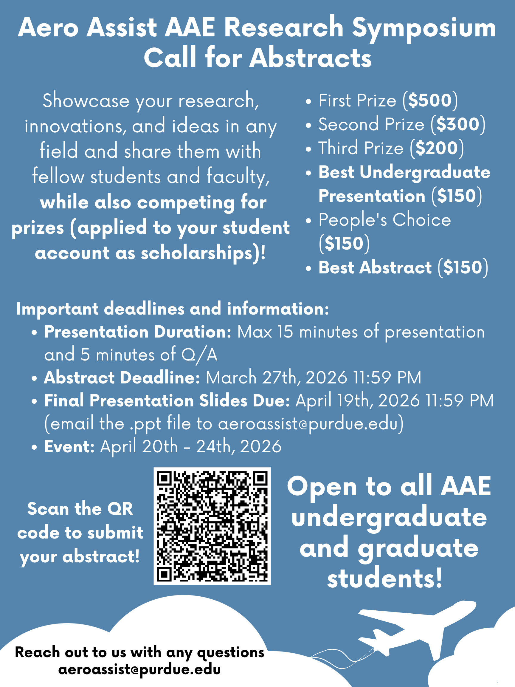 This is a reminder that the deadline to submit your abstract to the 2026 Call for Abstracts for the Aero Assist Research Symposium Series is approaching soon (Abstract Deadline: March 27th, 2026 11:59 PM)! The symposium is open to both graduate and undergraduate students! This is your chance to showcase your research, innovations, and ideas in any field and to share them with fellow students and faculty, while also competing for cash prizes!