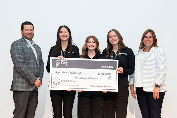 The group of four students will share a $20,000 prize for their winning entry, SoyFoliate, in the annual contest sponsored by the Indiana Soybean Alliance. The award was presented Tuesday (March 22) during a reception at the Indianapolis Roof Ballroom.