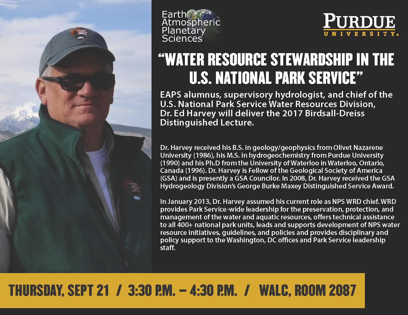 EAPS Alumnus, supervisory hydrologist, and chief of the US National Park Service Water Resources Division, Dr. Ed Harvey will deliver the 2017 Birdsall-Dreiss Distinguished Lecture