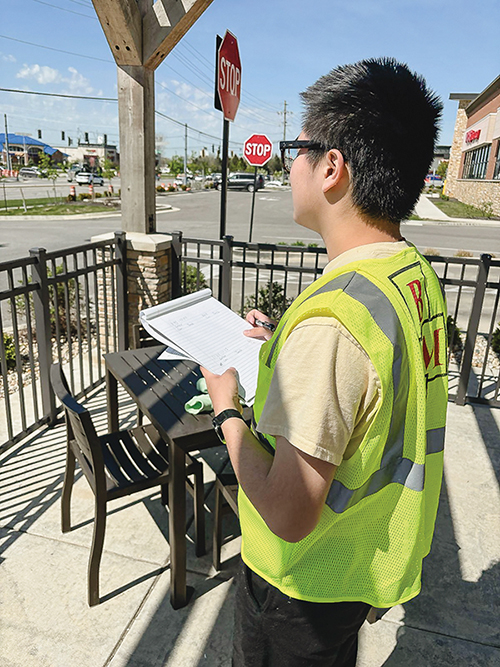 Civil engineering undergradate student Jiayu Zhu monitors and records street traffic data.