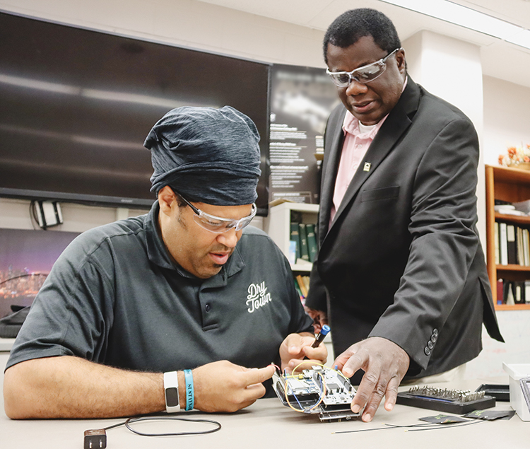 BELOW: Lyles School of Civil and Construction Engineering Professor Sam Labi (right) and graduate student researcher Richard Ajagu perform maintenance on the Data Diode.