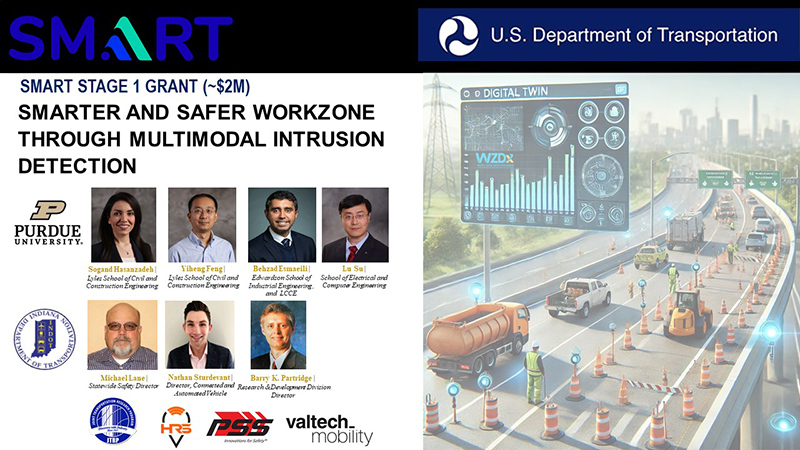 An interdisciplinary research team led by Sogand Hasanzadeh (CCE), Yiheng Feng (CCE), Behzad Esmaeili (IE/CCE), and Lu Su (ECE), in collaboration with INDOT and industry partners, has been awarded a nearly $2M SMART Stage 1 Grant from the U.S. Department of Transportation to improve work zone safety for drivers and workers.