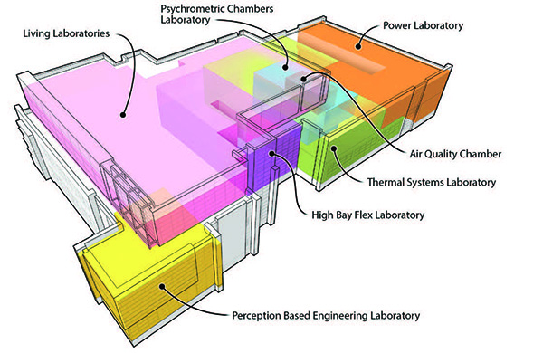 Researchers working at Purdue in the field of engineered environments had a vision for a facility with a fully instrumented living laboratory: offices with reconfigurable facades, multiple comfort delivery modes and primary equipment enabling controlled testing. They also imagined a perception-based engineering (PBE) facility to study the combined effects of lighting, acoustics, air quality, vibration, temperature, humidity and air flow on occupant perceptions and performance. They dreamed of creating a center to house these unique facilities along with more traditional laboratory-scale test facilities that are useful for controlled testing of building envelopes, lighting and facades, air distribution, cooling and heating equipment, heat exchangers, compressors and more.