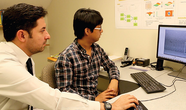 Mohammad Jahanshahi, assistant professor of civil engineering, and Fu-Chen Chen, PhD student, review results using the CRAQ system.