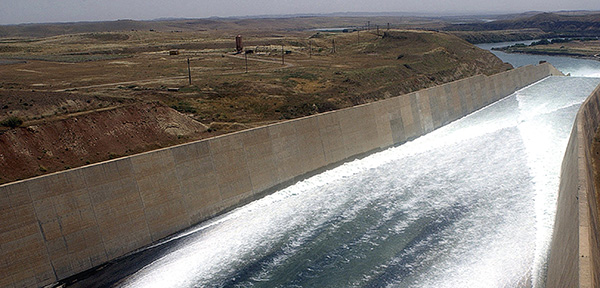 Water flows down the Mosul Dam chute. The spillway was built with a “ski jump” section to dissipate the energy of outflowing water. The dam is located on the Tigris River. It was built in 1986 and is Iraq’s largest hydraulic structure. Photo: U.S. Army, Brendan Stephens