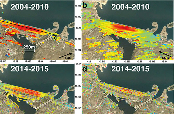 Perissin’s team developed a multisensor cumulative deformation map for the dam, generated from space-based interferometric synthetic aperture radar measurements from the Italian constellation COSMO-SkyMed and the European sensor Sentinel-1A from 2014 through 2016. The data spanning 2004-10 was acquired with the European Envisat satellite.