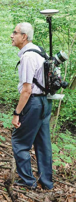 “We’ve developed a backpack system equipped with GPS and inertial navigation systems as well as LiDAR sensing,” said Ayman Habib, the Thomas A. Page Professor of Civil Engineering. “The LiDAR system sends more than one quarter million pulses per second. Each one of these pulses derives an XYZ coordinate. The traditional total station and digital level surveying method captures a few hundred points a day in wooded areas. Using this new technology, millions of points are captured within a few minutes.”