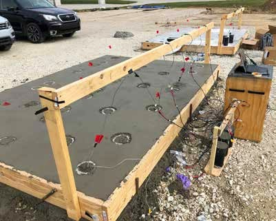 Lu’s team conducted a large-scale slab testing project to understand the in-situ concrete strength development using different approaches for obtaining samples, including conventional molded cylinder, cast-in-place sample and a core sample. The 8-by-12-foot slabs were prepared at Purdue’s Center for Aging Infrastructure to simulate the practical construction of concrete pavement. The researchers tested various ages of concrete slabs including some recently poured and others left for one year for long-term monitoring.