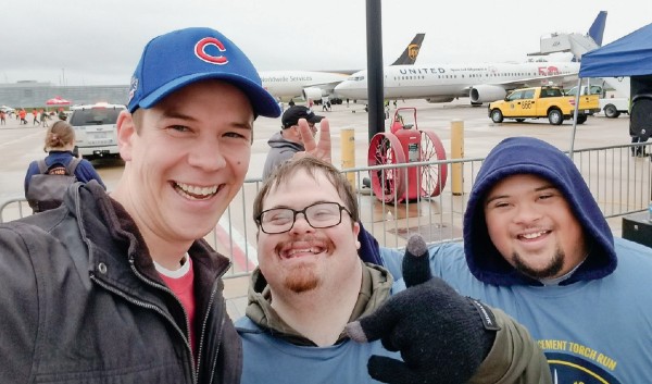 Drake with Harry and Mitchell, Special Olympics Athletes, at the 2019 O’Hare Plane Pull, a fundraiser for Special Olympics Illinois.