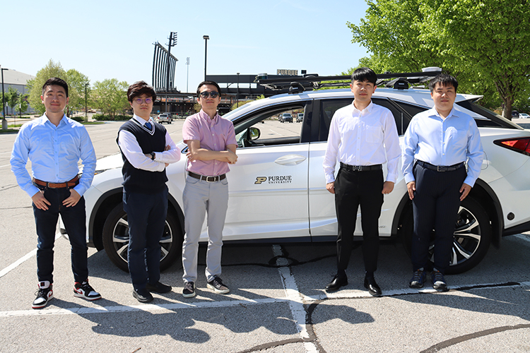PhD students Yunsheng Ma (left) and Juanwu “David” Lu test automated driving features on their automated vehicle platform.