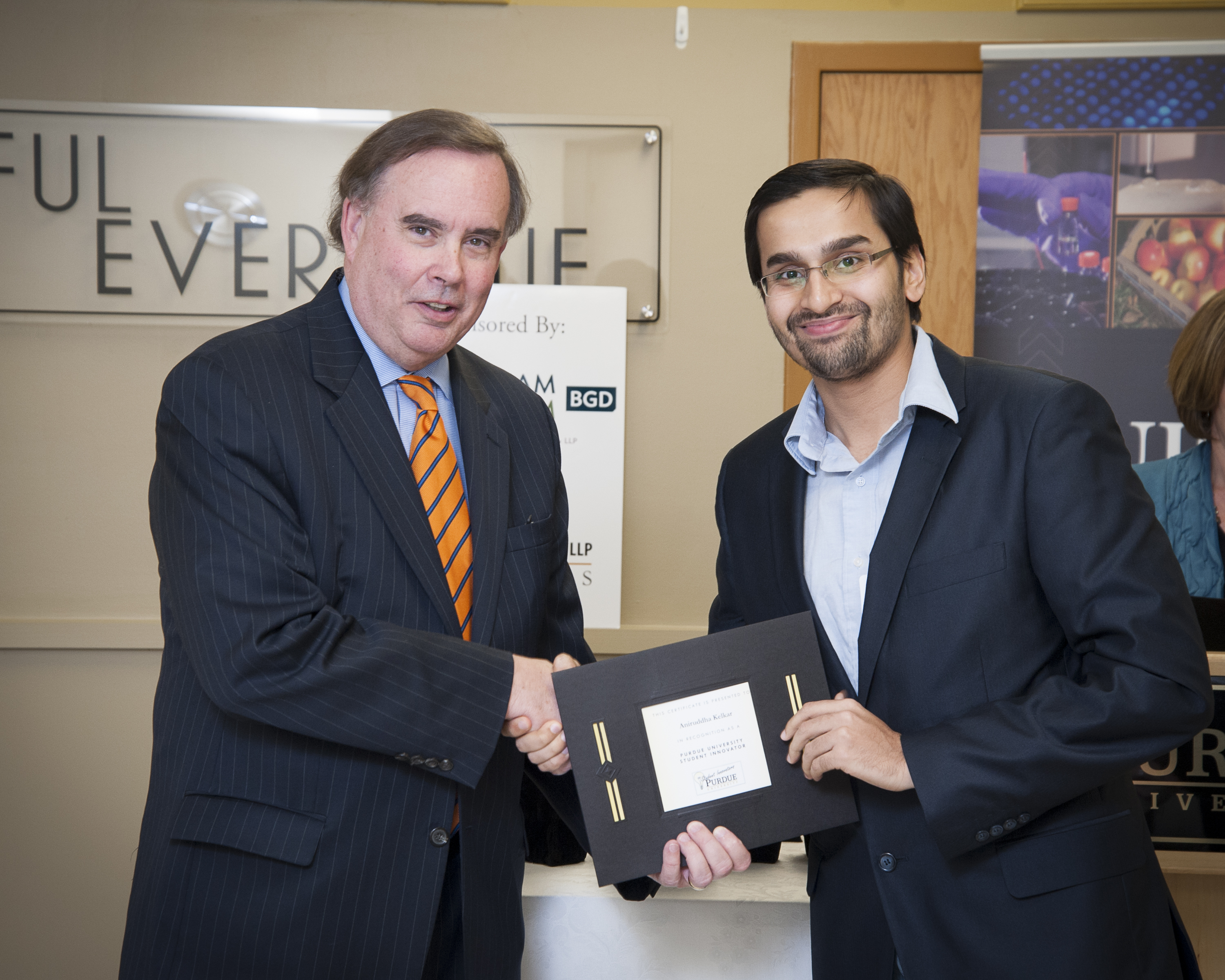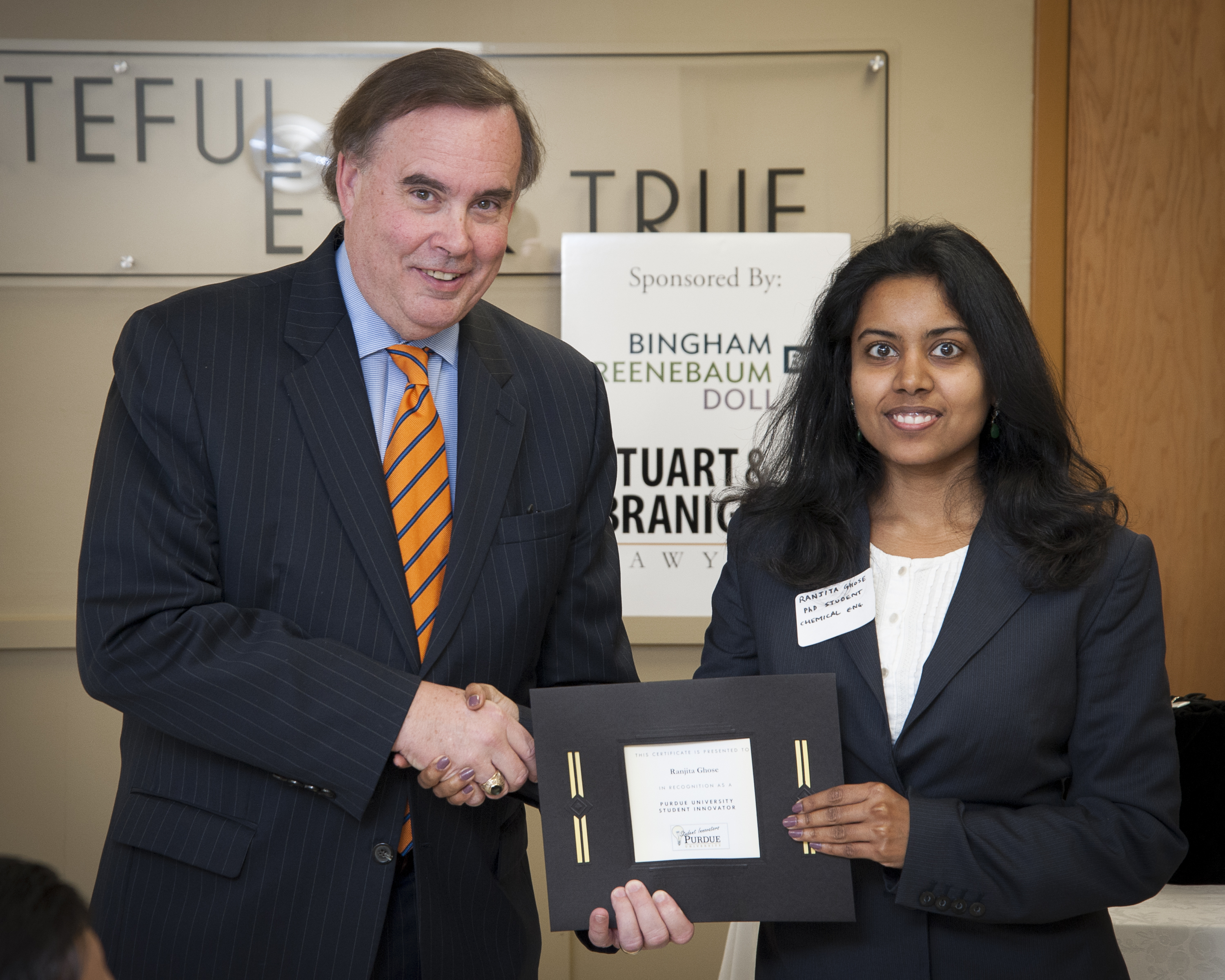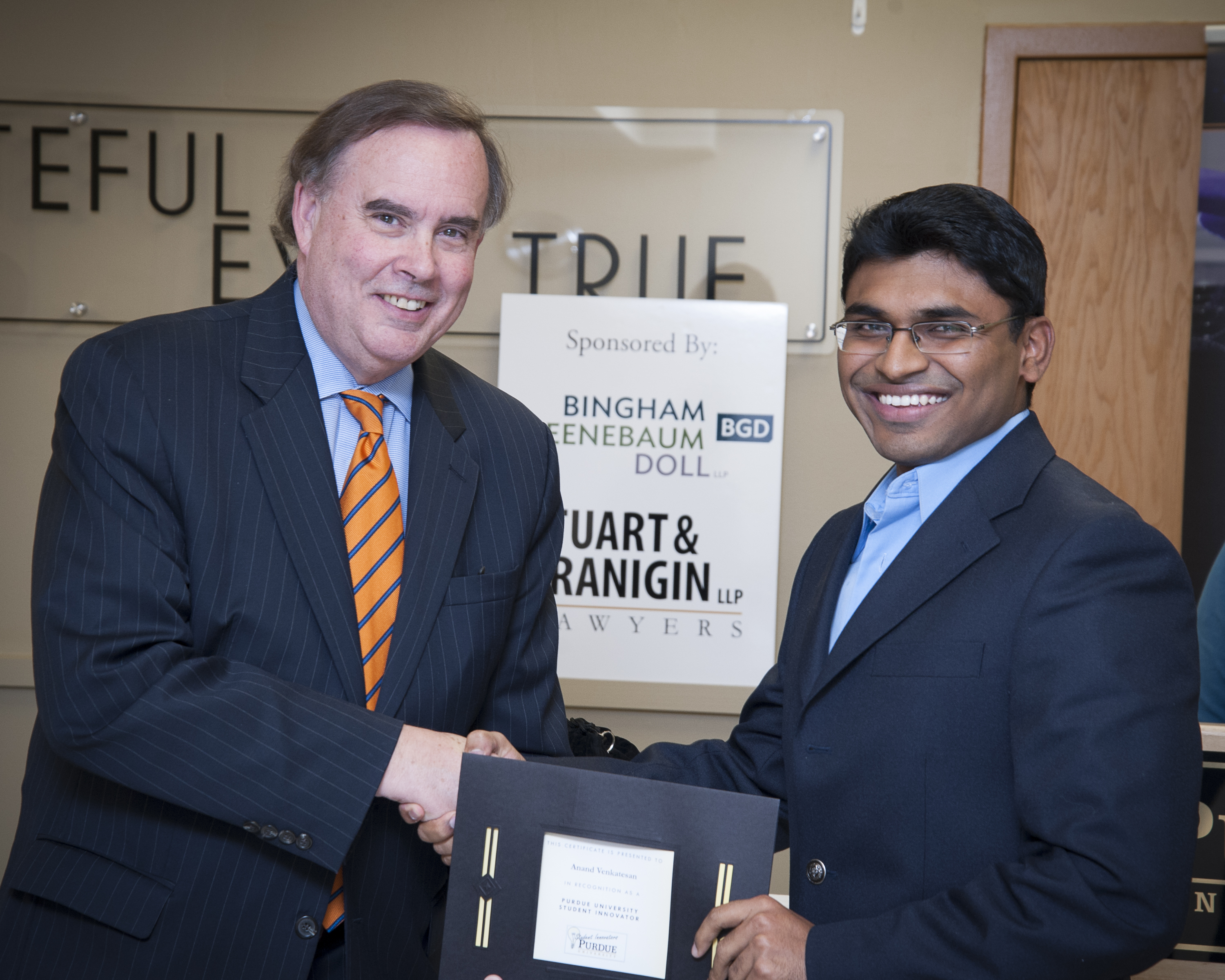 Four ChE graduate students: Ranjita Ghose, Aniruddha Kelkar, Krishnaraj Sambath and Anand Venkatesan were felicitated at the Purdue Student Innovator reception on December 5. The reception was attended by acting President Sands as well other officials from the Burton D. Morgan center, Office of Technology Commercialization and Krannert. They were honoring Purdue students who have filed for intellectual property during 2012.