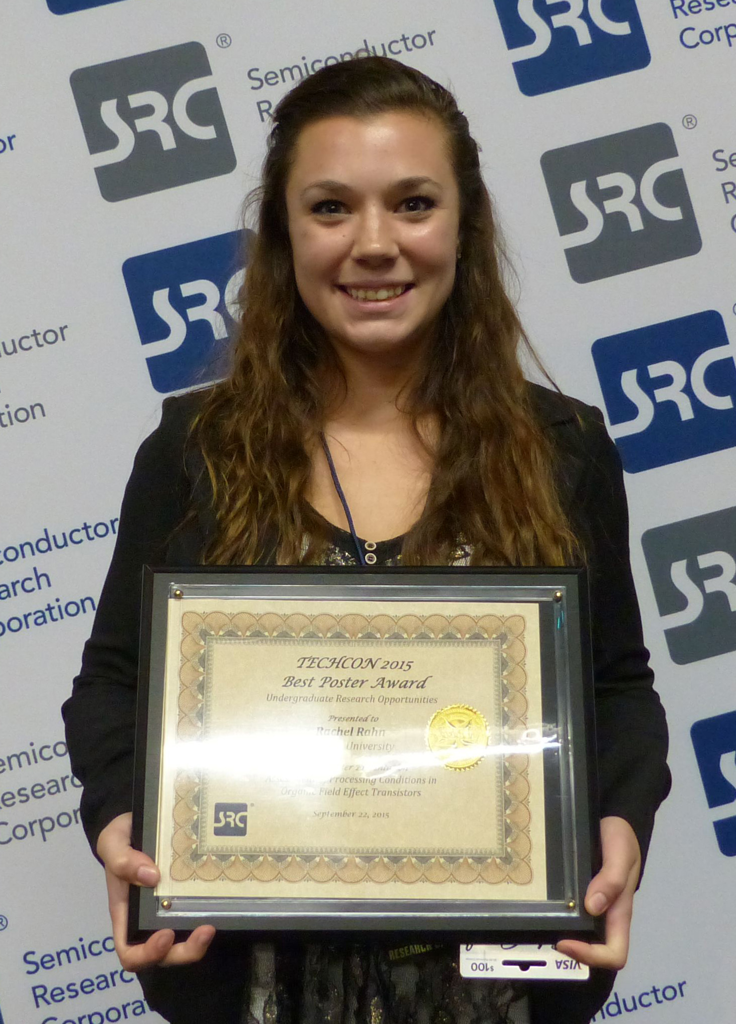 Rachel Rahn, a junior in chemical engineering, received the first place poster for her presentation "Assessment of Processing Conditions in Organic Field Effect Transistors."