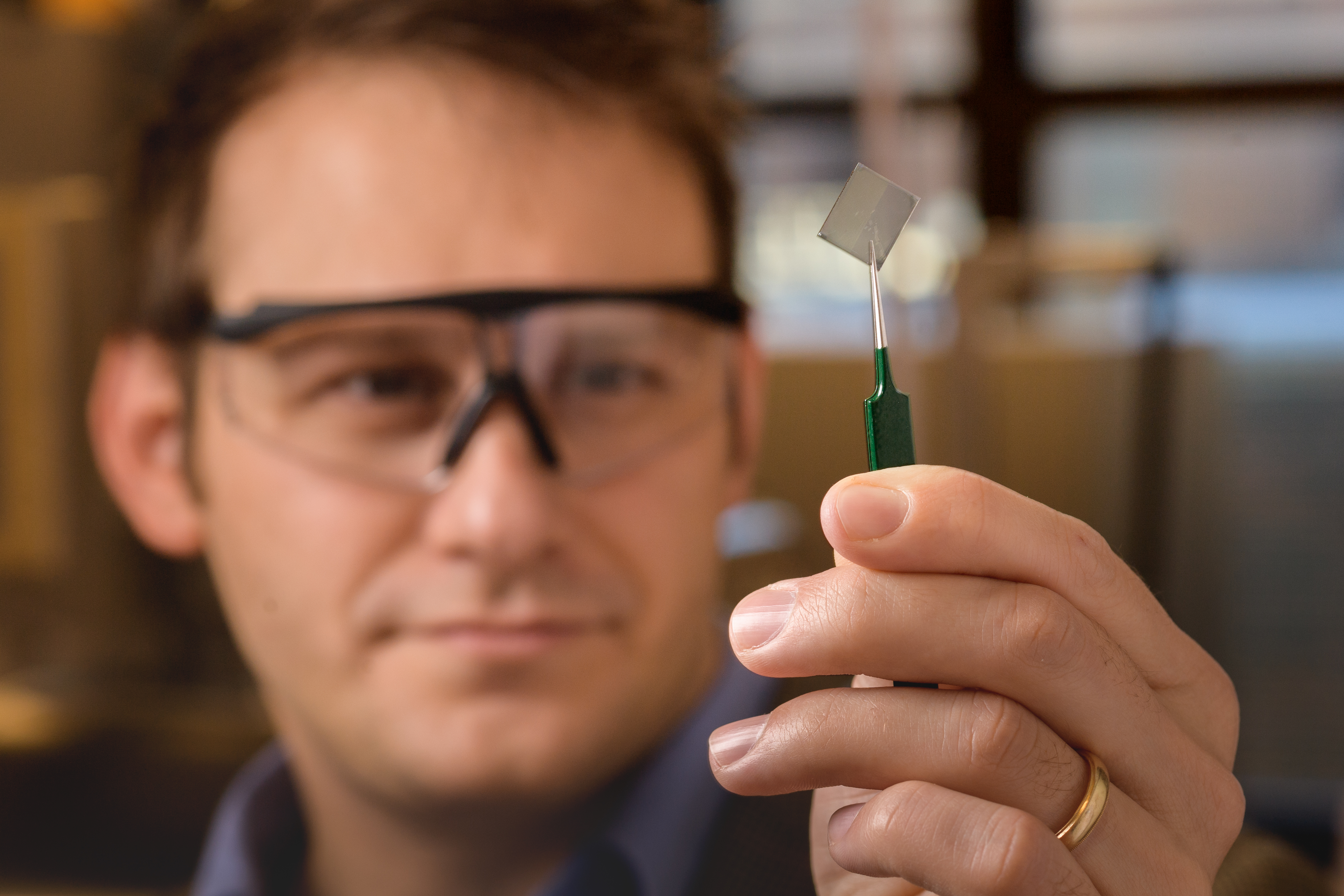 Photo caption: Dr. Brett Savoie, Assistant Professor of Chemical Engineering, evaluates the optical properties of a stretchable transparent conductor synthesized in the Davidson School of Chemical Engineering. (Purdue University photo/John Underwood)