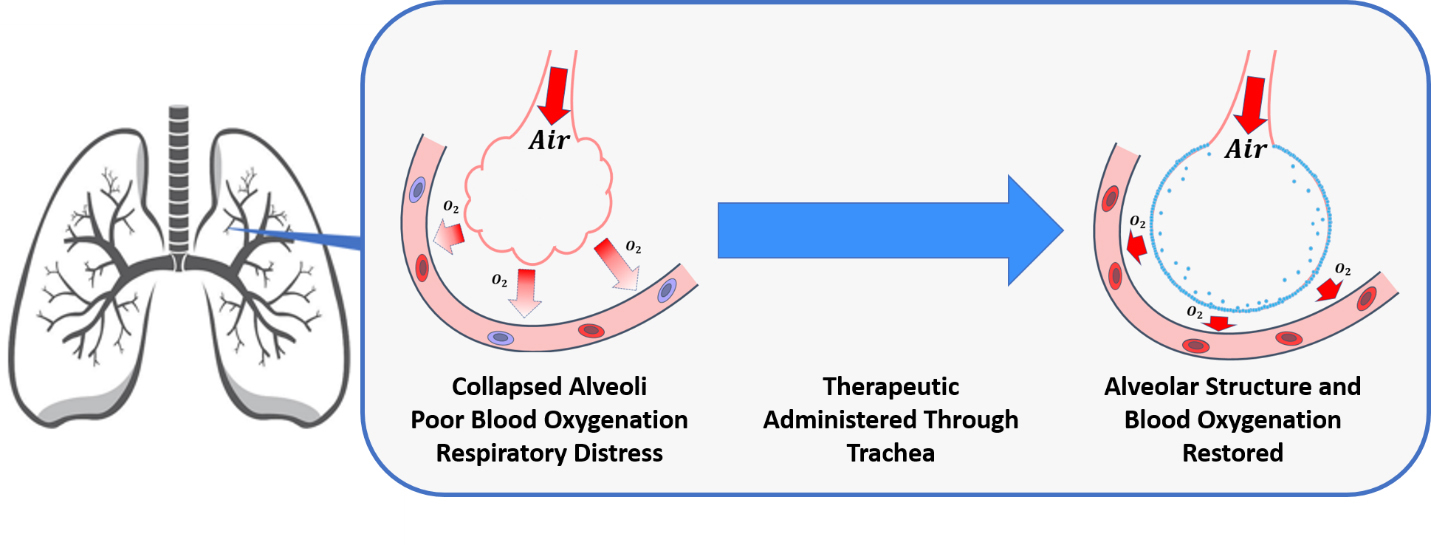 Spirrow Therapeutics aims to commercialize their biocompatible Polymer Lung Surfactants, which can safely mimic the behavior of natural lung surfactant without being susceptible to the deactivation mechanisms introduced by ARDS. Polymer Lung Surfactants work by replacing the impaired natural lung surfactant in the deep lungs. They restore and maintain alveolar structure, allowing adequate blood oxygenation to resume while also reducing the mechanically induced damage that inherently results from ventilator-assisted breathing.