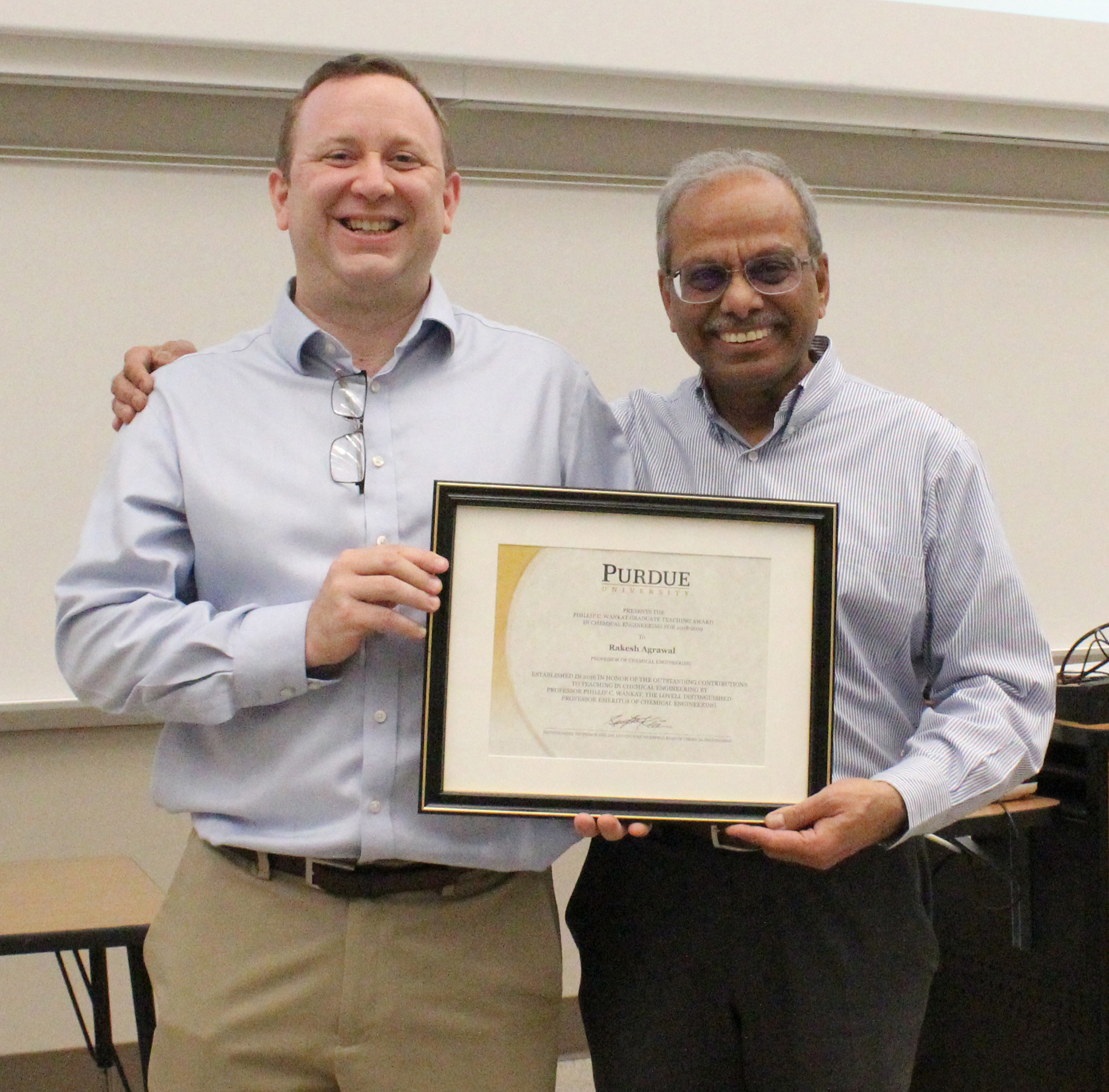 Two Davidson School of Chemical Engineering faculty were recently recognized for their excellence in teaching undergraduate and graduate students. Dr. Rakesh Agrawal, the Winthrop E. Stone Distinguished Professor of Chemical Engineering, and Dr. Stephen Beaudoin, Professor of Chemical Engineering, were honored at the September 24, 2019 graduate seminar.