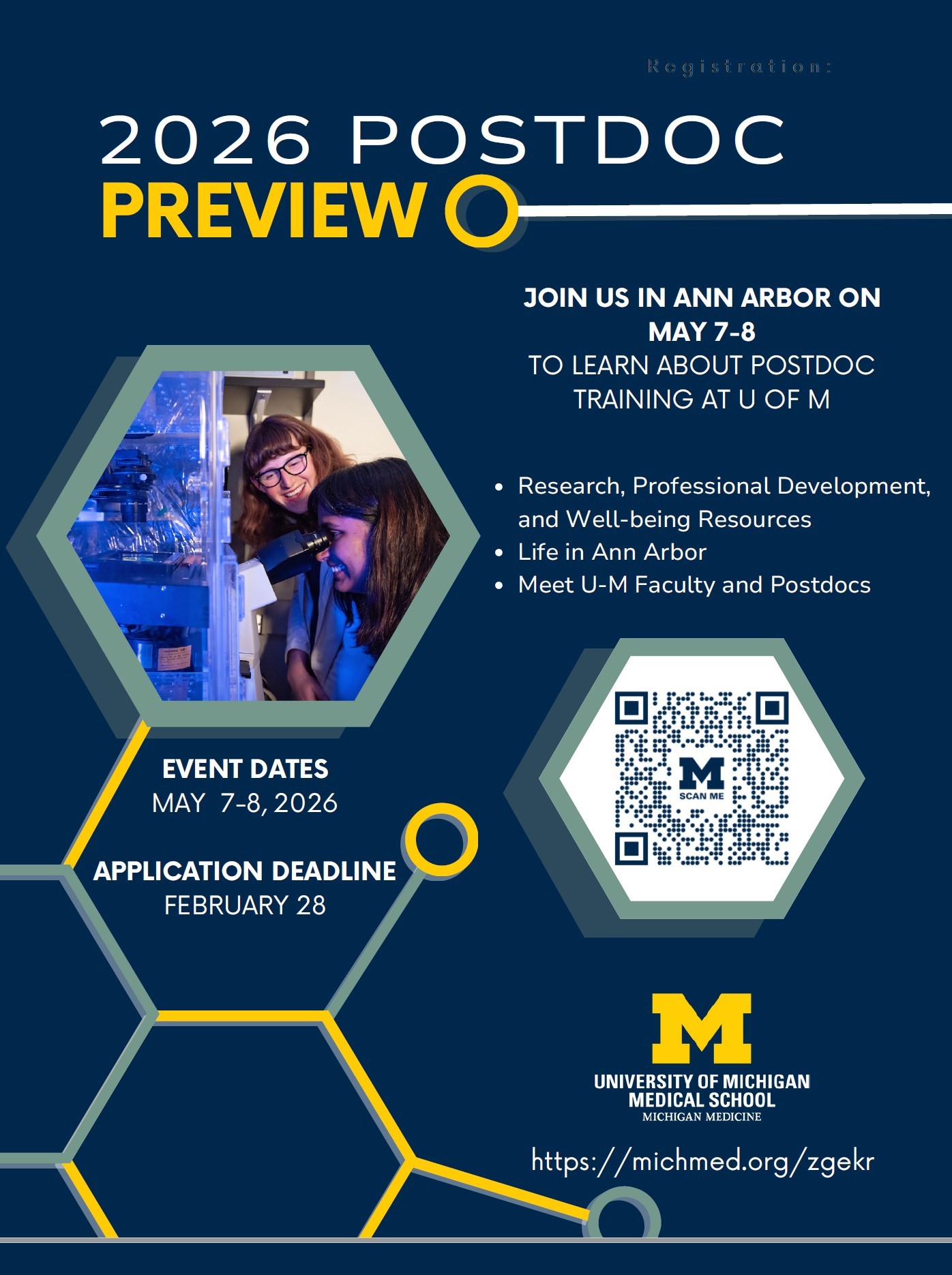 Applications are now being accepted for the University of Michigan Medical School in-person Postdoc Preview recruiting event happening on May 7-8, 2026! The Spring event awards up to 20 applicants the opportunity to explore the extensive postdoctoral research and training opportunities available at U-M. During a fully-funded two-day visit, candidates will interview with prospective mentors, network with our current postdocs, and learn about life in Ann Arbor.