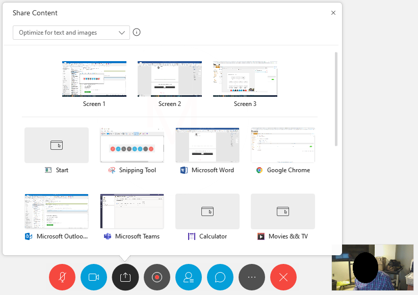 - To share content, click the sharing icon at the bottom of the screen and share the appropriate screen. Note that Mac users may need to authorize screen recording within settings in order for screen sharing to work.
