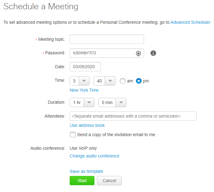 - Alternately, you can schedule a meeting by clicking the Schedule a meeting link and filling out the required information. We recommend setting a meeting password that is easier to type than the one generated by the system.