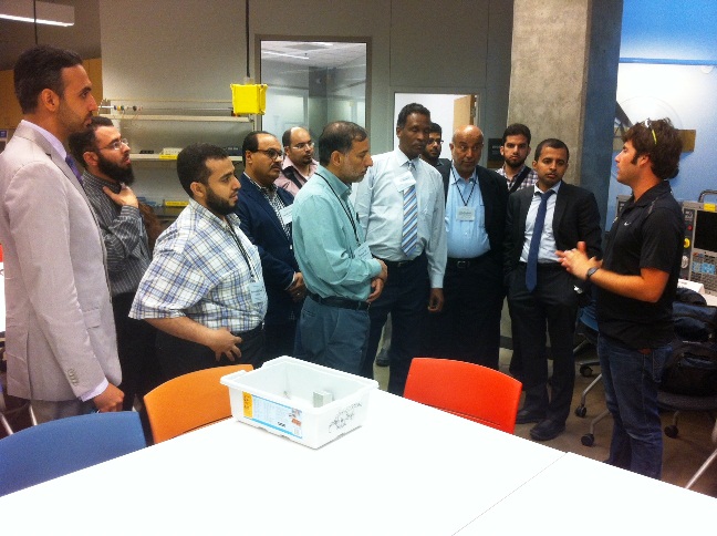 Patrick La Petina, ENE instructional support coordinator, (right) explains the i2i Demonstration Studio to King Fahd University of Petroleum and Minerals professors.