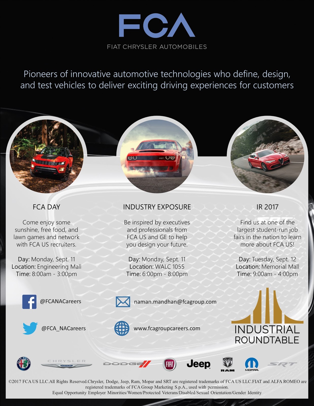Industrial Roundtable activities are taking place September 11-13, 2017. We have outlined a timeline for some of the events taking place on campus as well as additional job postings and general information.