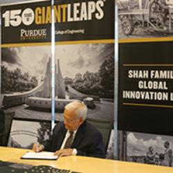 Purdue’s Shah Family Global Innovation Lab will be a place of learning, exploration and problem solving with international impact. Formerly the Global Engineering’s Innovation for International Development (I2D) Lab, the new program is launched by a $2.5M gift from Manahar (Manu) Shah, who received a master’s degree in Mechanical Engineering from Purdue in 1968. Shah and his family’s impactful commitment was announced on Nov. 2 at the signing ceremony.