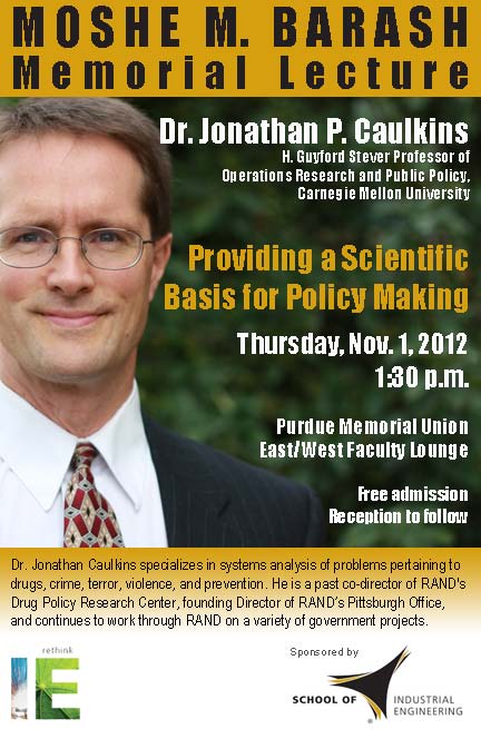 2012-11-01 13:30:00 2012-11-01 14:30:00 America/Indiana/Indianapolis Moshe M. Barash Memorial Lecture Dr. Jonathan Caulkins - H. Guyford Stever Professor of Operations Research and Public Policy - Carnegie Mellon University Purdue Memorial Union - East/West Faculty Lounge