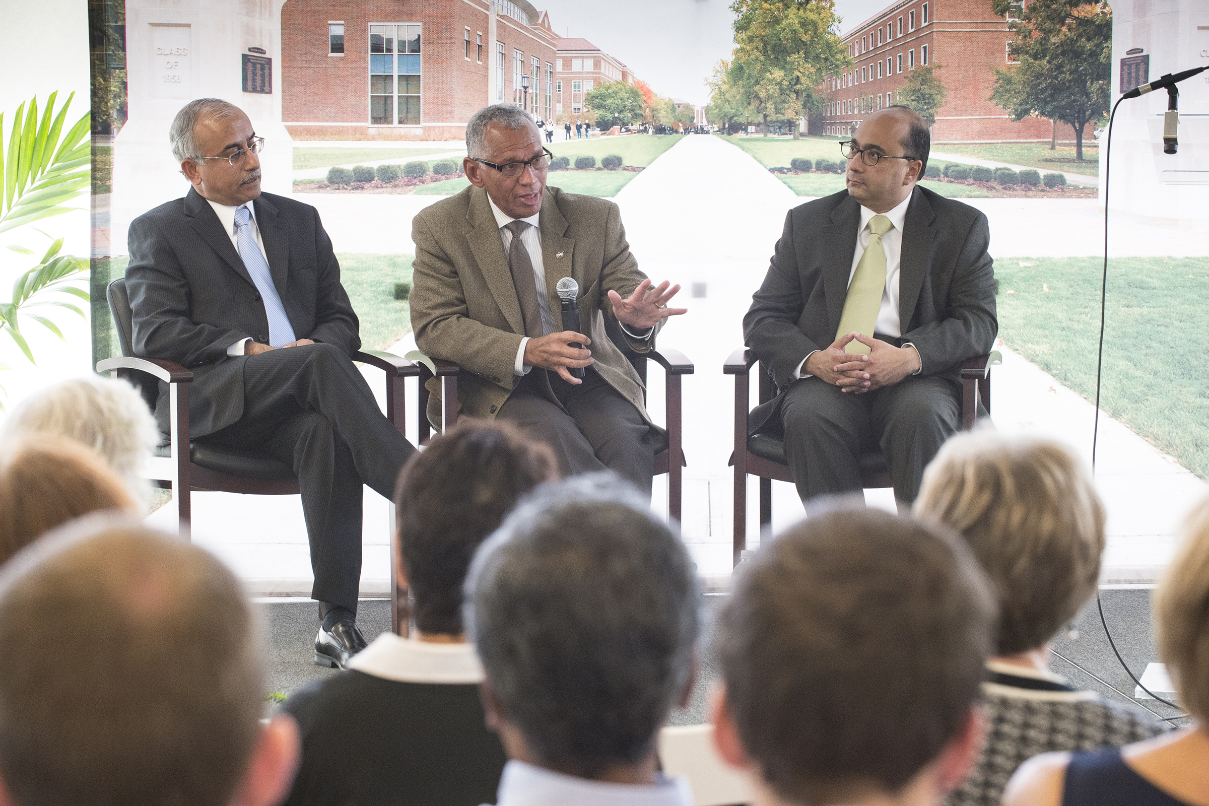 (PHOTO:) Provost Deba Dutta, NASA administrator Charles Bolden and Abhijit Deshmukh, head of the School of Industrial Engineering, at the kickoff of the Purdue Systems Collaboratory, which is aimed at integrating multidisciplinary teaching and research stressing the "convergence of knowledge" in problem solving. (Purdue University photo/John Underwood)