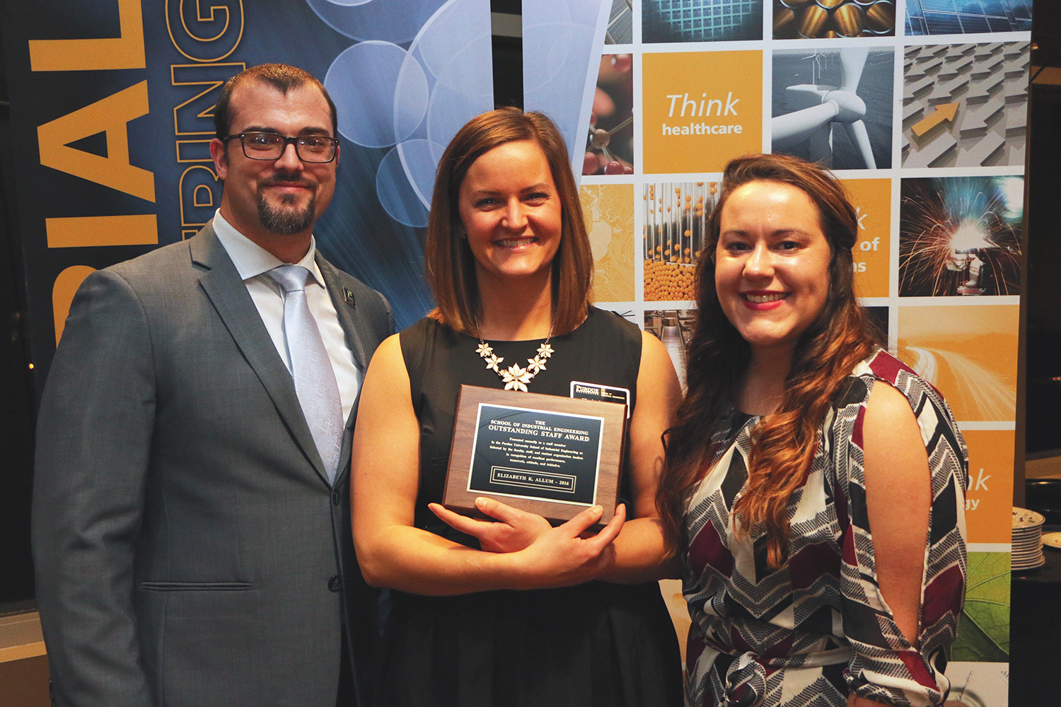 Academic Advisor Elizabeth Allum received the Outstanding Staff Award, voted on by Purdue IE faculty, staff and student organization presidents. It recognizes those who continuously go above and beyond the expectations of his/her position, exhibit a consistent pattern of congenial behavior to all contacts and treat others with respect, and have a positive attitude even under the most difficult of circumstances. Elizabeth’s nominator wrote: "Elizabeth is a great advisor, bringing positive energy to everyone she encounters. She has become consistent in reaching out to students and finding success in bringing out their full potential. The success of certain programs of the school is partly due to her abilities in presenting them to our students."