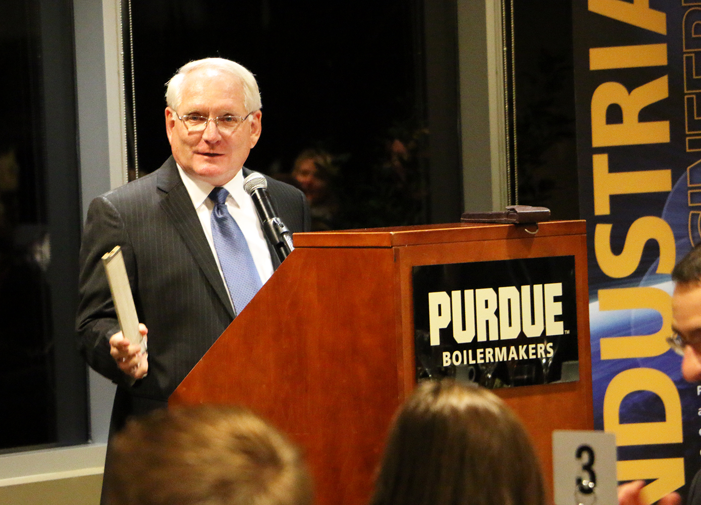 Alumnus Dennis Clark (BSIE 1972) spoke about his 34-year career with Eli Lilly and why he supports Purdue IE. Senior Mallory Huff described many of the opportunities she's had to grow as a person while gaining an IE degree, and urged her fellow students to consider how they might give back to the School in the future.