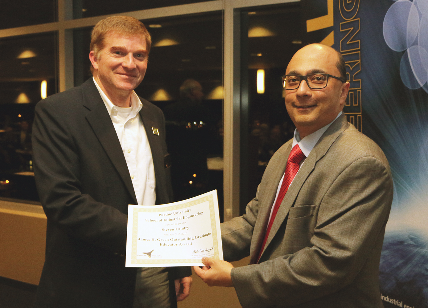 Associate Head of IE and Associate Professor Steve Landry received the James H. Greene Outstanding Graduate Educator Award. This award is named in honor of Dr. James H. Greene, Purdue IE faculty from 1948-1983. Greene was the driving force behind obtaining blanket approval of the IE PhD program in 1959 and was known for excellence in graduate education and student advising. This award was endowed in his honor by Dr. J. Franklin Sharp, one of his former students.