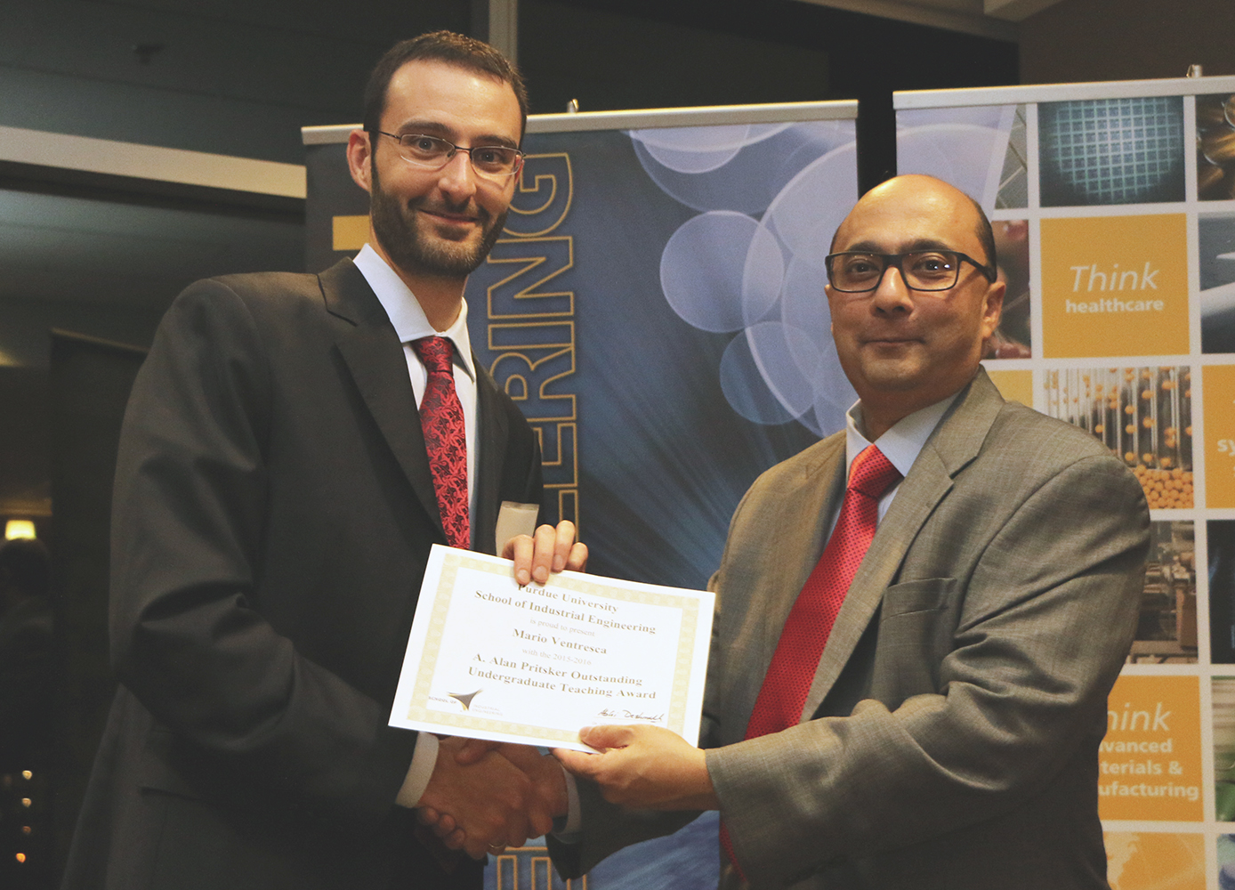 Assistant Professor Mario Ventresca received the Pritsker Best Teacher Award, given annually to an outstanding teacher in Purdue IE and selected by its student body for excellence in teaching. This award was established with a gift from A. Alan and Anne G. Pritsker. A. Alan Pritsker was a professor in IE at Purdue from 1970 to 1998, was elected to the National Academy of Engineering in 1985, and received the Frank and Lillian Gilbreth Industrial Engineering Award in 1991. He was an exceptional instructor, and his approach embodied his "Teach what you do – do what you teach" philosophy. Recipients of this award are selected by the IE undergraduate student body under rules and procedures established by the IE faculty.