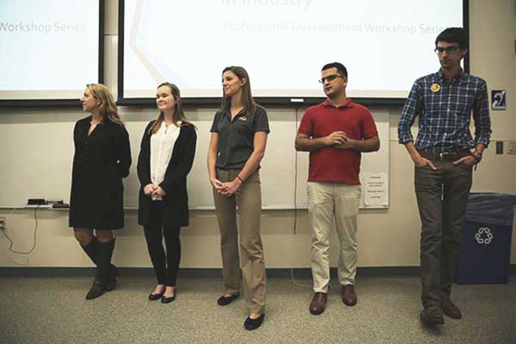 Fifty-five people attended to hear from fellow IE students who held co-op or internship positions at Disney, Meijer, Frito Lay, Roche, and PWC. "I thought the workshop was helpful," said sophomore IE student Kyle Ellsworth. "The speakers brought a lot of different experiences to the table, and that gave me a good idea of the different roles I can have as an IE when I graduate."