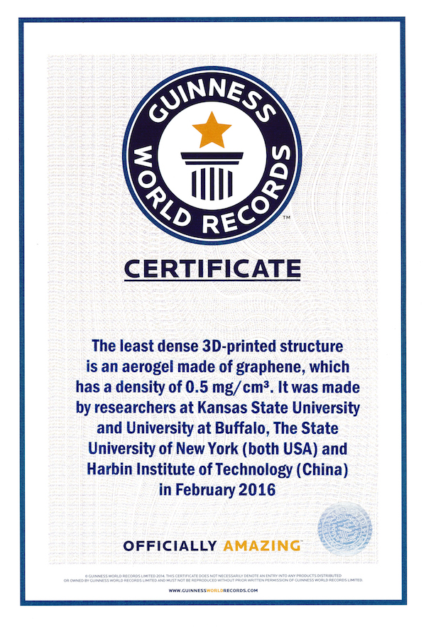 Lin (PhD 2013), Kansas State University assistant professor of industrial and manufacturing systems engineering, and his research team from Kansas State, the University at Buffalo, and Lanzhou University (China), have printed the least dense solid graphene aerogel. GUINNESS WORLD RECORDS documented the team’s achievement and will include their achievement in the 2018 edition of the records book. Lin studied at Purdue IE under Professors C. Richard Liu and Gary Cheng.