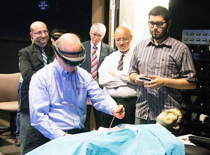 Pres. Daniels toured the Envision Center on Feb. 1. Staff and students demonstrated a number of projects they’ve been working on, including the System for Telementoring with Augmented Reality (STAR), developed by Wachs' and Associate Professor of Computer Science Voicu Popescu's team.
