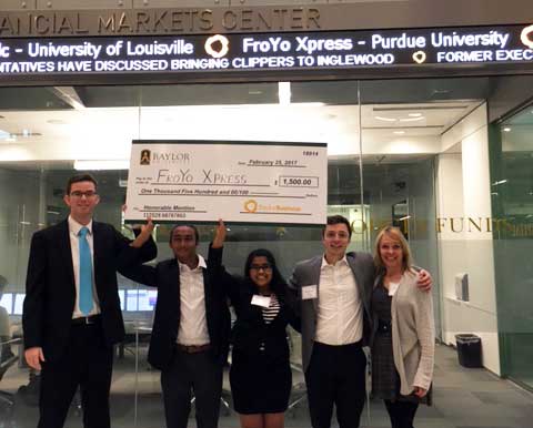 IE undergrad team members Marek Davis and Henry Berkemeier, with Aarti Panda (Computer Science) and Bharat Agarwal (Krannert), won an honorable mention and cash prize for their automated frozen yogurt kiosk project, FroYo XPress. The 6th Annual Baylor New Venture Competition took place at Baylor University in Texas Feb. 23-25 and included two tracks: Internet and Consumer Technology Companies, and Non-Internet and Consumer Technology Companies. The on-campus event is a two-day business plan and speed pitch competition promoting student entrepreneurship.