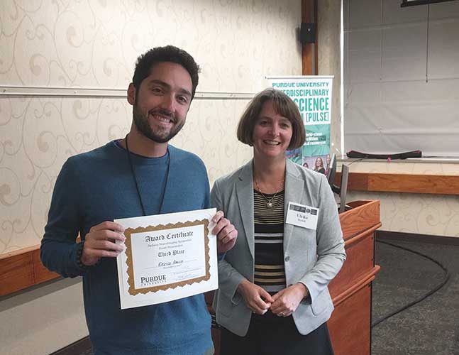 The attendees also visited the new Purdue MRI facility and held a student poster session. Out of the 37 posters submitted, Amico won 3rd prize for his symposium poster titled "Mapping joint structural-functional connectivity traits in the human connectome". CONNplexity lab members Amico, Goñi, and PhD student Uttara Tipnis, with IE Assistant Professor Mario Ventresca, also submitted a poster titled "Modeling diffusion processes in the brain through a cooperative learning ant colony-inspired algorithm".