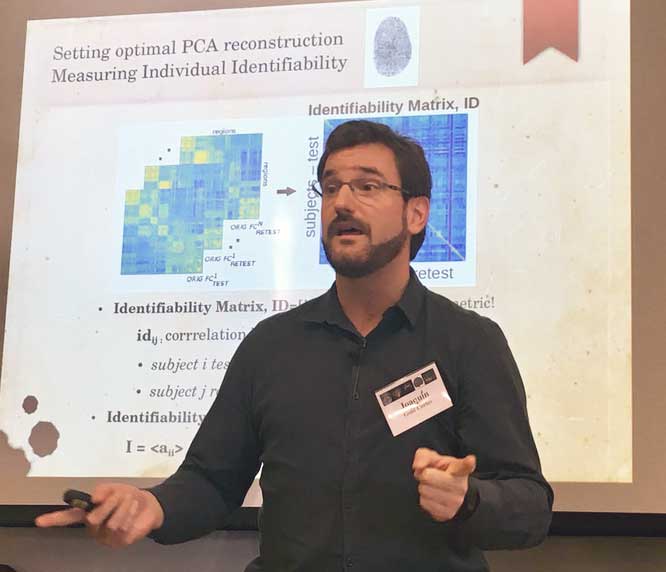 Symposium topics included "Cognitive Neuroimagining", "Data Blitz", "Advanced imagining techniques", "Neurological and Neurodegenerative Disorders", and "Connectomics and Data Mining". For this last topic, Goñi gave a talk titled "Individual fingerprints of human brain functional connectomes".