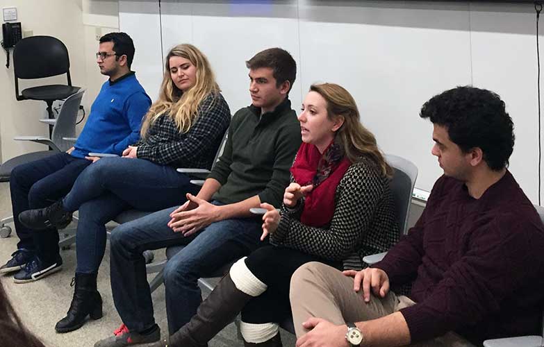 Anneliese Smith speaks as fellow panelists (l to r) Raghav Gandhi, Liz Held, Christian Gatmaitan, and Eren Bozbag listen during an IE 200 discussion.