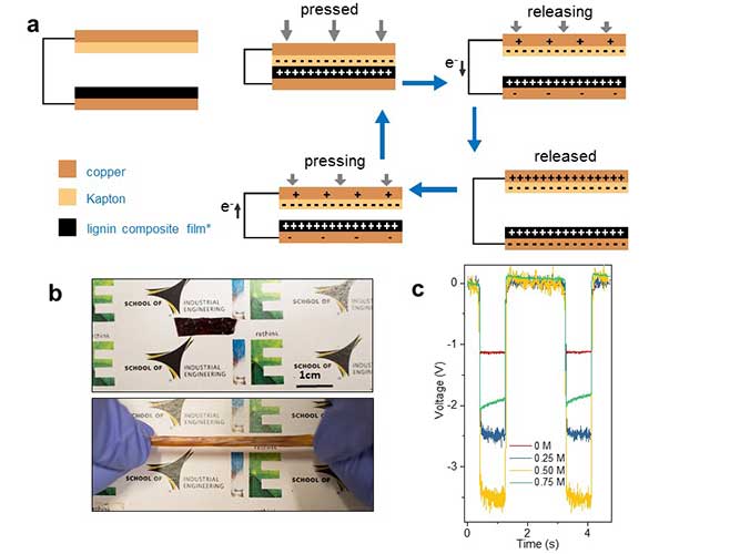(a) The operation mechanism of the lignin-based TENG. (b) The brittle, opaque lignin film becomes semi-transparent and stretchable after engineering its material properties. (c) Typical output voltage profile from lignin-based TENG upon mechanical deformation. (Provided by Wenzhuo Wu)