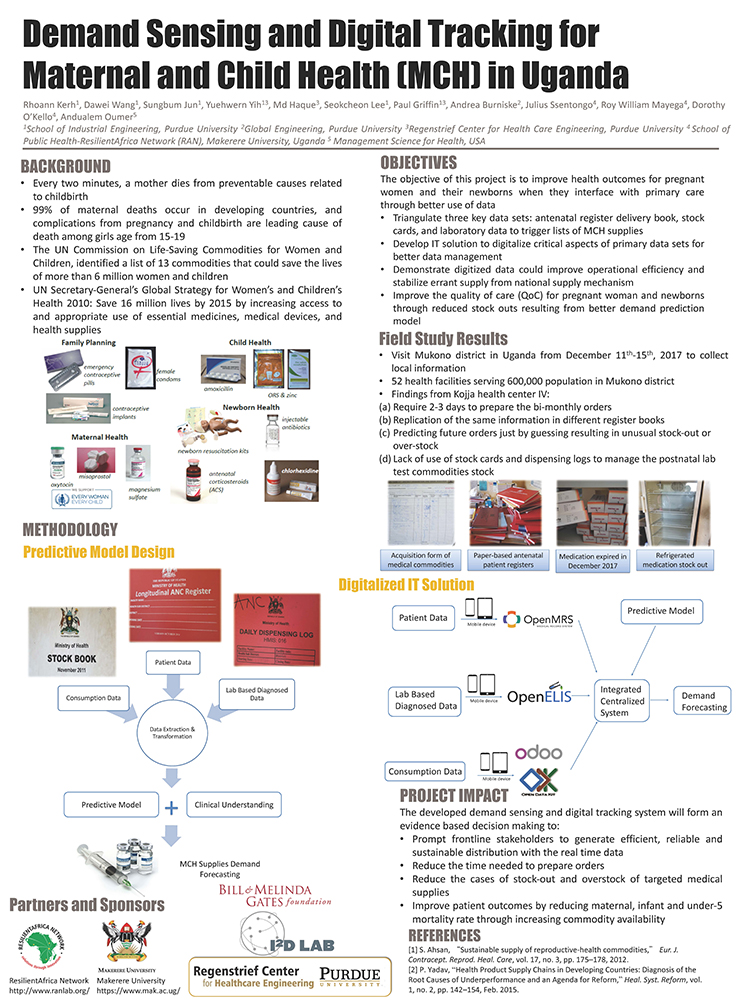 "We are trying to improve maternal and child health (MCH) care in Uganda by matching the commodities demand with supply through applying system engineering principles and cloud-based smart sync IT solutions. Three key data sets including antenatal patient register, MCH commodities data and lab based diagnosed data will be triangulated to build the demand forecast predictive model, and IT solutions will be utilized to digitalize critical aspects of primary data for better data management," explains Kerh.