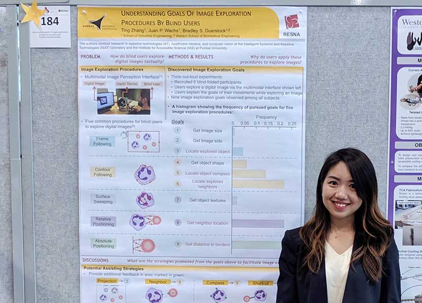On June 25, Zhang competed in a poster session as part of the FastForward program for the Rehabilitation Engineering and Assistive Technology Society of North America (RESNA). Her poster, titled "Understanding Goals of Image Exploration Procedures by Blind Users", showed how computer-supported interfaces enable blind users to explore digital images in real time. The research presents the goals behind different user behaviors for non-vision image understanding, and details image assistive strategies developed to increase the efficiency of blind users exploring images non-visually and independently.