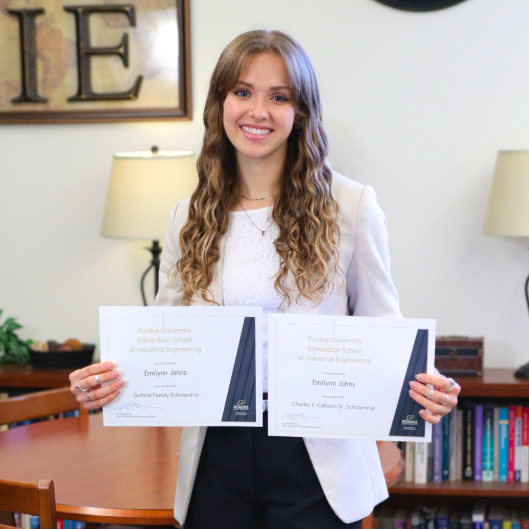 Over the past 3 years, Emilynn has received 6 scholarships from the Purdue University Edwardson School of Industrial Engineering. These scholarships have had a tremendous impact on her Purdue experience by alleviating financial burdens and allowing her to fully dedicate herself to academic, professional, and leadership opportunities. She is deeply grateful for the support of Purdue’s Industrial Engineering community and its donors, whose generosity has empowered her to grow as both an engineer and a leader.